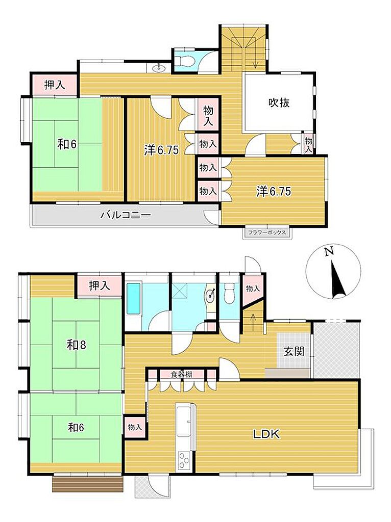 | 建物構造 | 木造/2階建 | 間取り詳細(帖) | 和室 8畳(1階)和室 6畳(1階)リビングダイニングキッチン 19.4帖(1階)和室 6畳(2階)洋室 6.7帖(2階)洋室 6帖(2階) | ||