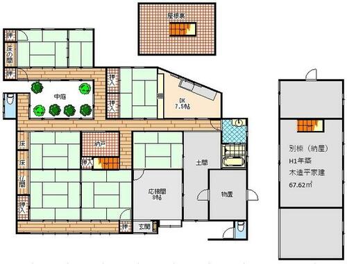 | 備考 | 農地(畑)1136㎡が付属する一括売買。農地法3条または5条許可申請必要。・農地1136㎡が付属しています。建物は昭和4年に新築して、昭和47年に増築、改修により維持管理された264.06㎡の母屋に加え、平成元年築の別棟67.62㎡納屋と36.00㎡倉庫が付属しています。・仲介手数料:売買代金の3%+60,000円 | ||||