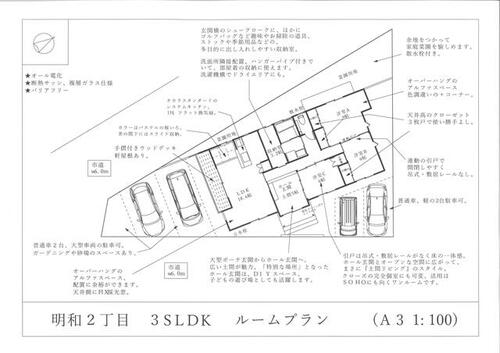 | 備考 | ※設計書類等あり①建築確認書類(申請書、確認通知書、検査済証)、②地盤調査書、③白蟻防除保証書、④瑕疵保険証書、⑤その他取扱説明書、⑥建築中写真記録※現況渡し。※司法書士は売主側指定。・築浅、with土間スタイル築浅平屋、SOHO利用OK。 | ||||