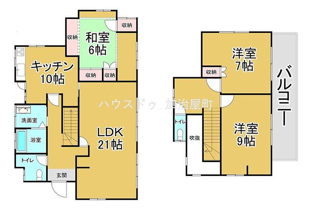 | 建物構造 | 木造/2階建 | 間取り詳細(帖) | 和室 6畳(1階)洋室 7帖(2階)洋室 9帖(2階)リビングダイニング 21帖(1階)キッチン 10帖(1階) | ||