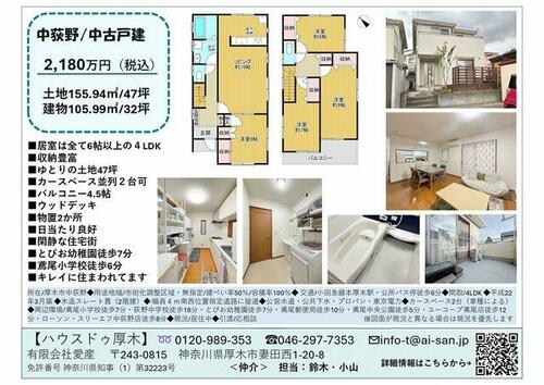 | 備考 | ◇交通:小田急小田原線「本厚木」駅 バス乗車時間26分 バス停「公所」徒歩7分◆敷地面積:155.94m2(47.17坪)◇建物面積:105.99m2(32.06坪)◆築年月:2010年3月◇間取り:4LDK◆駐車場/カースペース2台分並列駐車可能(車種による)・私道負担:なし・◆敷地面積:155.94m2(47.17坪)◇建物面積:105.99m2(32.06坪)◆駐車場/カースペース2台分並列駐車可能(車種による)◇南西向きのため陽当たり良好 | ||||
