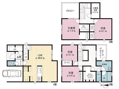 | 備考 | 建物面積内車庫部分約8.5m2含・私道負担:なし・整形地立地です。全居室フローリング、リビング階段です。全居室収納、床下収納、ウォークインクローゼット、シューズインクローク、屋根裏収納(グルニエ)付でスッキリ暮らせます。・未入居物件 | ||||