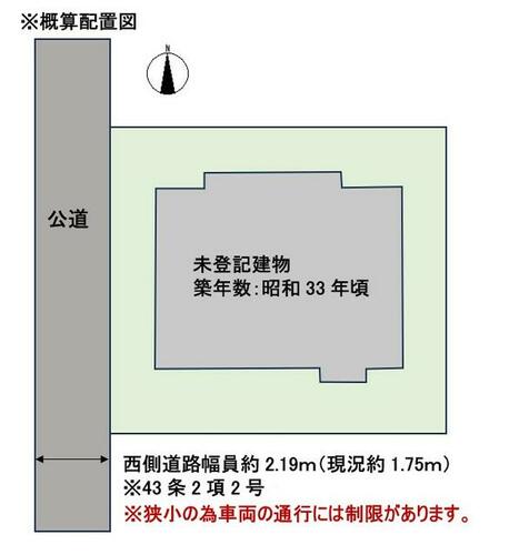 | 備考 | ※現況と相違する場合は現況優先とします。※築年数は課税台帳参照※昭和39年7月・昭和48年3月10日増築※再建築時条件あり※現況有形有姿公簿売買(境界非明示)※司法書士売主指定※契約不適合責任免責とします。※都市計画道路予定地内(都市計画法第53条の許可を要す)※内見時は売主立会いのため要連絡※前面道路狭小の為、車両の通行には制限があります。(西側道路幅員約2.19m※現況約1.75m)・お好きにリフォームしてお使いいただけます♪都市計画道路予定地内です!内見時は事前にご連絡下さい! | ||||