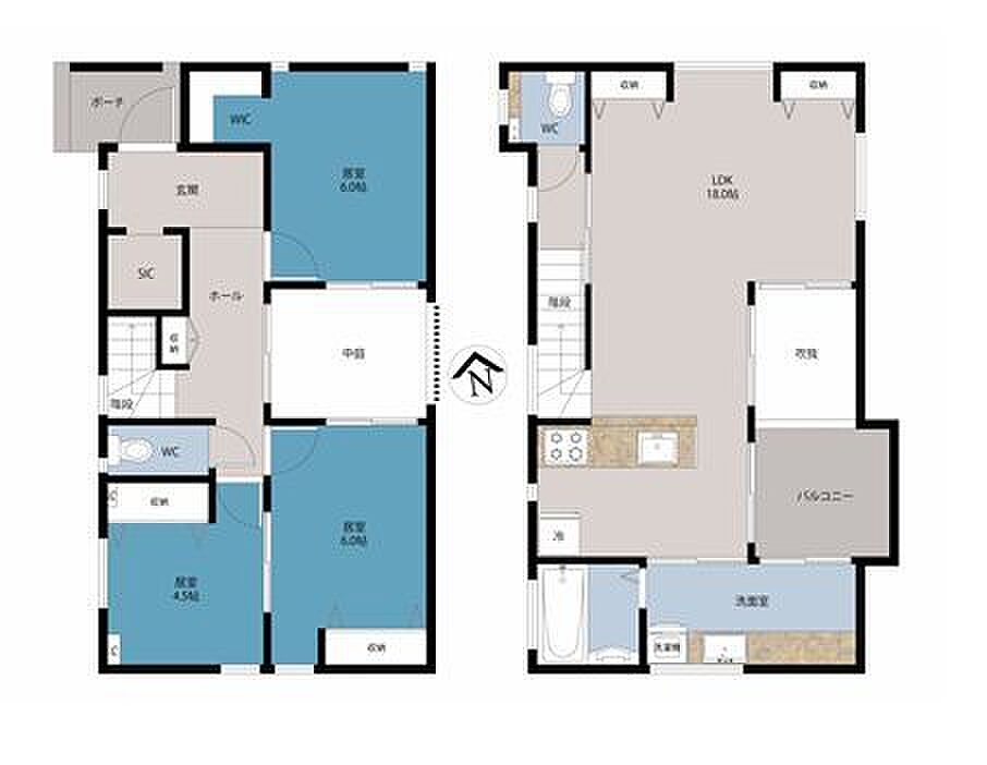 | 建物構造 | 木造/2階建 | 間取り詳細(帖) | リビングダイニングキッチン 18帖(2階) | ||