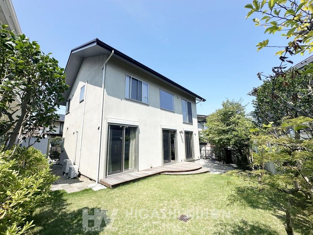 外観はシンプルで飽きのこない白を基調としています。南に間口が広く、隣地ともお庭分スペースが開いているので、陽当り・通風ともに良好です。植栽の緑に囲まれた清々しい雰囲気の2階建て戸建です。