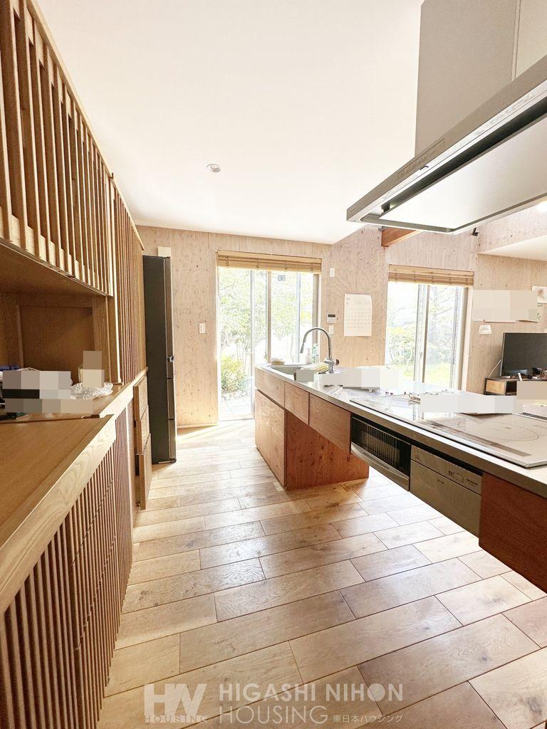 キッチンは対面式オープン仕様のペニンシュラキッチン。IHのコンロ下に空間を設けることで閉塞感がなくスッキリ、お掃除などのお手入れもしやすいつくり。木の温もりを感じるカップボードも備え付けで便利です。