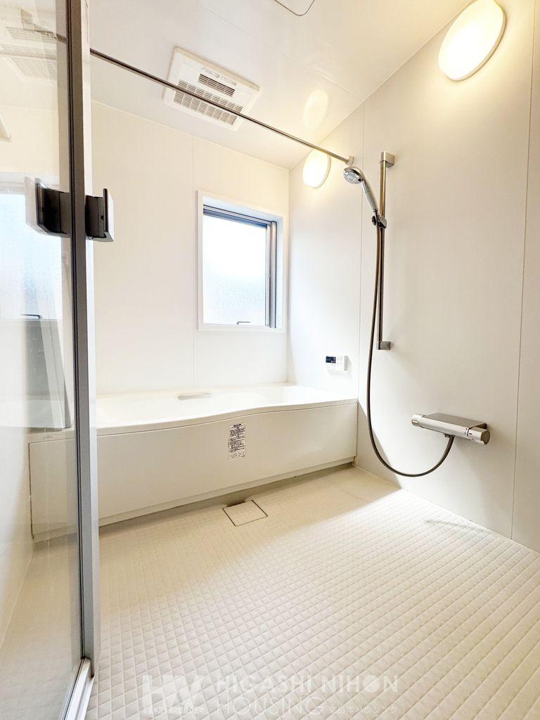 白で統一されたシンプルで清潔感のある浴室。余計なものがない空間は、お手入れもしやすく、洗い場が広く取れているのでお子様との入浴時にも便利です。浴室乾燥・暖房完備、窓設置で換気も充分カラッと保てます。