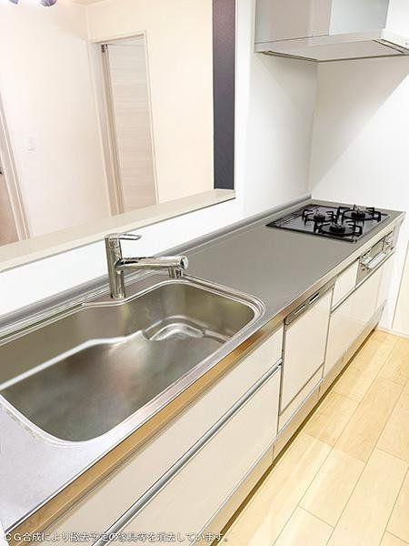 【キッチン】食洗機とグリル付きの3口コンロが備わり、家事の時短に。天板下の収納には、調理器具や調味料などたっぷりしまえます。※CG合成により撤去予定の家具等を消去しています。/2025年10月撮影