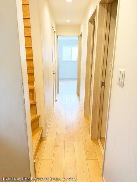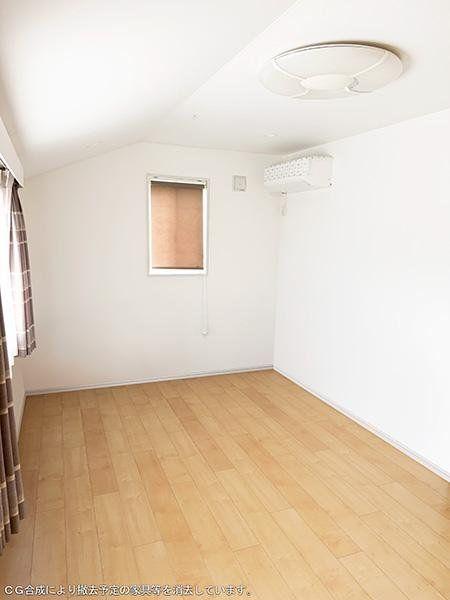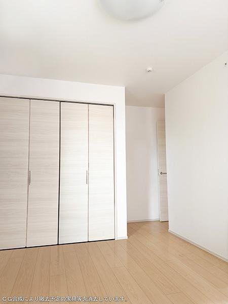 【洋室/約7.5帖】LDKに隣接する洋室。収納が2箇所に設けられ、衣類や小物、季節家電などをすっきり整理できます。※CG合成により撤去予定の家具等を消去しています。/2025年10月撮影