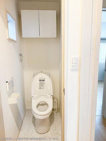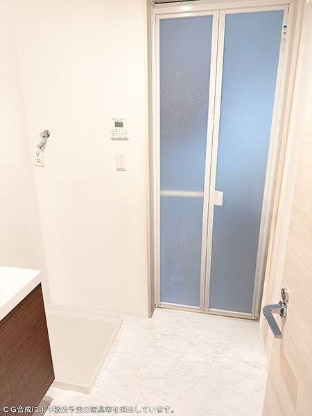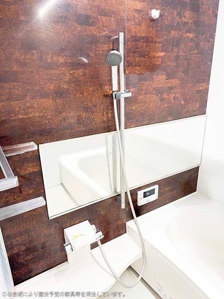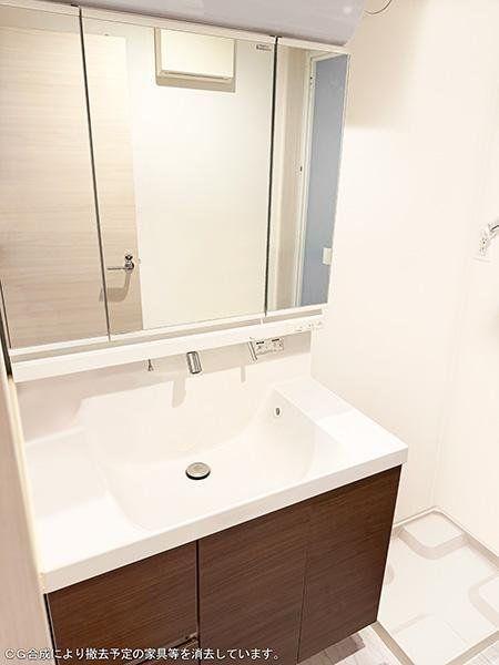 【洗面所】身支度に便利な三面鏡タイプの洗面台。鏡裏とボウル下に収納スペースが確保され、洗面用品や日用品もすっきり収まります。※CG合成により撤去予定の家具等を消去しています。/2025年10月撮影