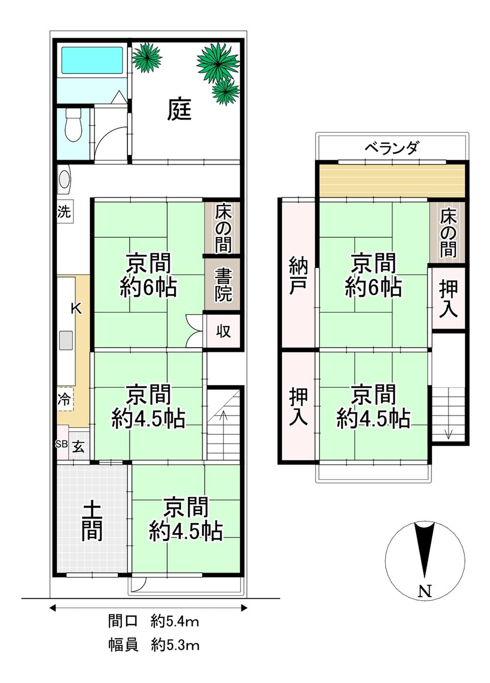 土地権利 | 所有権 | 私道負担・道路 | 無、北5.4m幅(接道幅5.3m) | ||