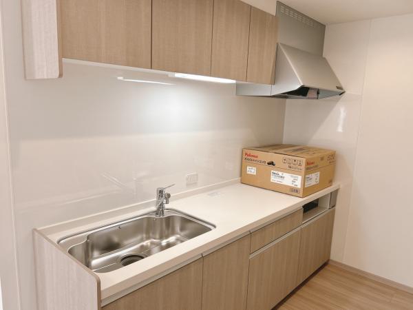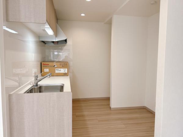 【キッチンスペース】キッチンを新品交換しました。背面はスペースを拡張し、冷蔵庫置き場、カップボード置き場としてご利用いただけます。通路幅が約100センチあるので、お二人並んでも圧迫感なくお料理ができま