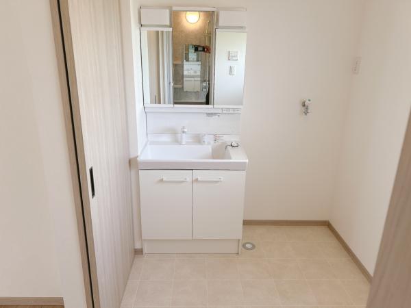 【洗面脱衣所】洗面所スペースを拡張し、約3帖になりました。タオルや脱衣かごを置いても狭くありません。床はクッションフロアを張りました。洗面室は床が濡れて、長年続くと床が心配ですが、シートですので耐水性