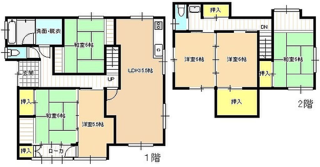 | 建物構造 | 木造/2階建 | 間取り詳細(帖) | リビングダイニングキッチン 15.5帖(1階)和室 6畳(1階)和室 6畳(1階)洋室 5.5帖(1階)洋室 6帖(2階)洋室 6帖(2階)和室 6畳(2階) | ||