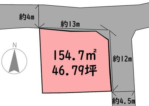 | 私道負担・道路 | - | 接道状況 | 北 4.0m 公道 接面13.0m東 4.5m 公道 接面12.0m | ||