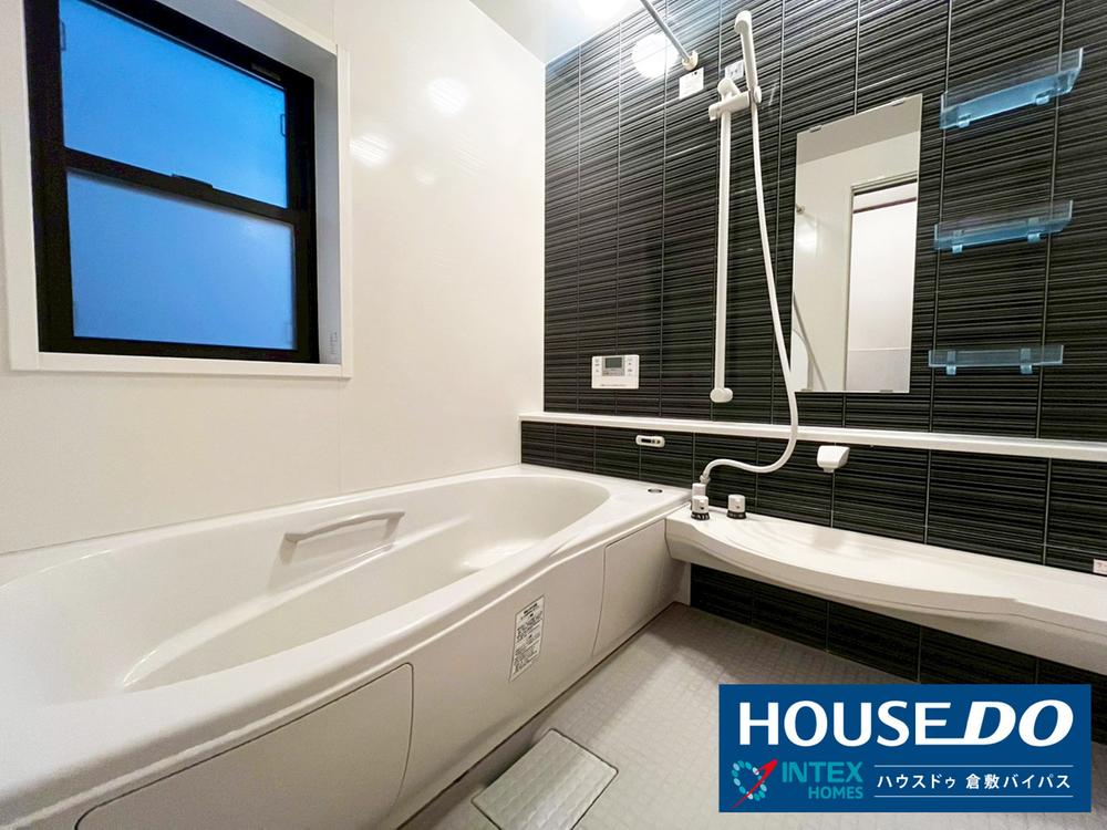 【一日の疲れを癒す、シックでモダンなバスルーム】アクセントパネルが魅力的な、広々としたお風呂です!ベンチ付きの浴槽で、お子様との入浴や半身浴も楽しめますね◎