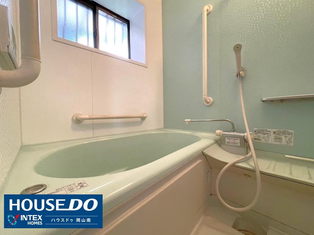 【窓付きで換気もバッチリ!ゆったり寛げる浴室】明るい水色のパネルが爽やかな印象の浴室です。窓があり、換気ができるのでカビ対策にも嬉しいですね!手すりも完備されており安全にお子様との入浴を楽しめます!