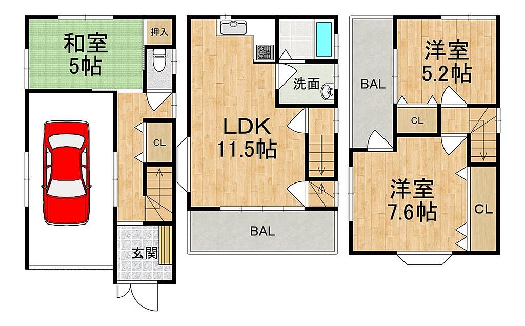 | 建物構造 | 木造/3階建 | 間取り詳細(帖) | 和室 5畳(1階)リビングダイニングキッチン 11.5帖(2階)洋室 7.6帖(3階)洋室 5.2帖(3階) | ||