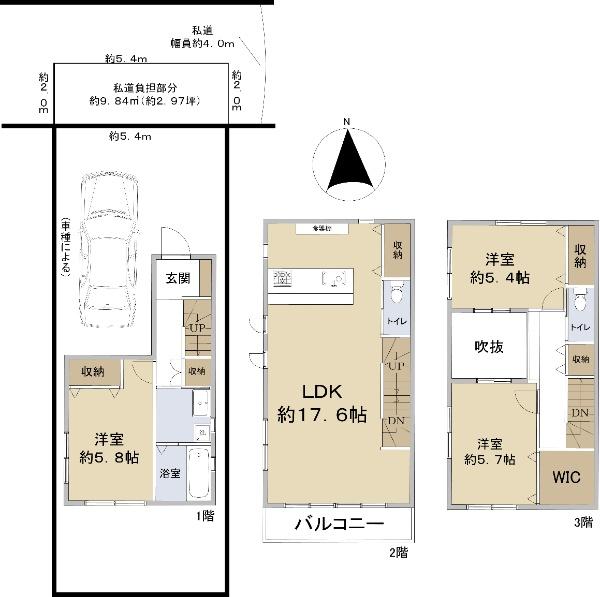| 土地権利 | 所有権 | 私道負担・道路 | 9.84㎡、北4m幅(接道幅5.4m) | ||