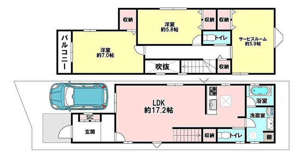 | 建物構造 | 木造/2階建 | 間取り詳細(帖) | リビングダイニングキッチン 17.2帖洋室 7帖洋室 5.8帖収納 5.9帖 | ||