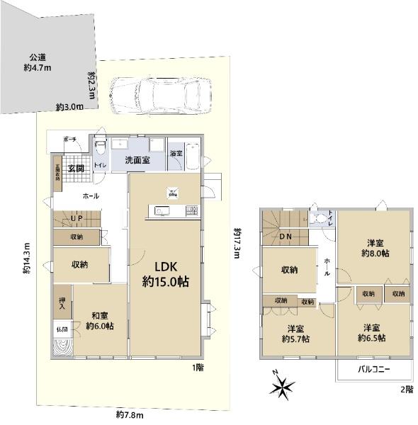 土地権利 | 所有権 | 私道負担・道路 | 無、西4.7m幅(接道幅5.3m) | ||
