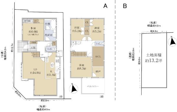 | 土地権利 | 所有権 | 私道負担・道路 | 2㎡、南4m幅(接道幅5.8m)、西4.2m幅(接道幅12.7m) | ||