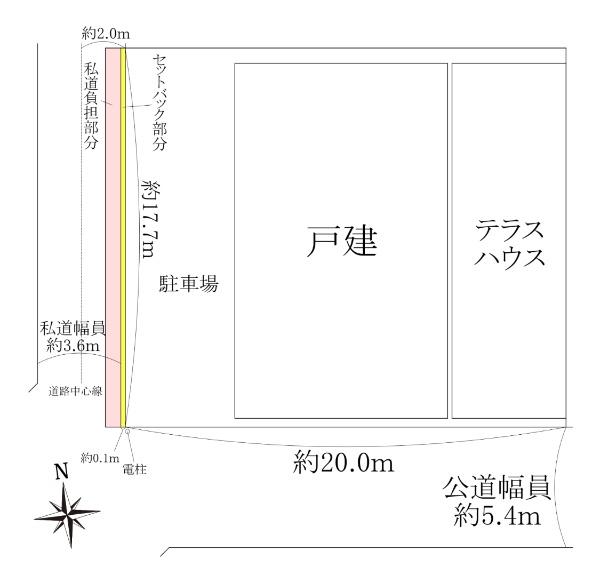| 土地権利 | 所有権 | 私道負担・道路 | 16.17㎡、南5.4m幅(接道幅20.1m)、西3.6m幅(接道幅17.7m) | ||