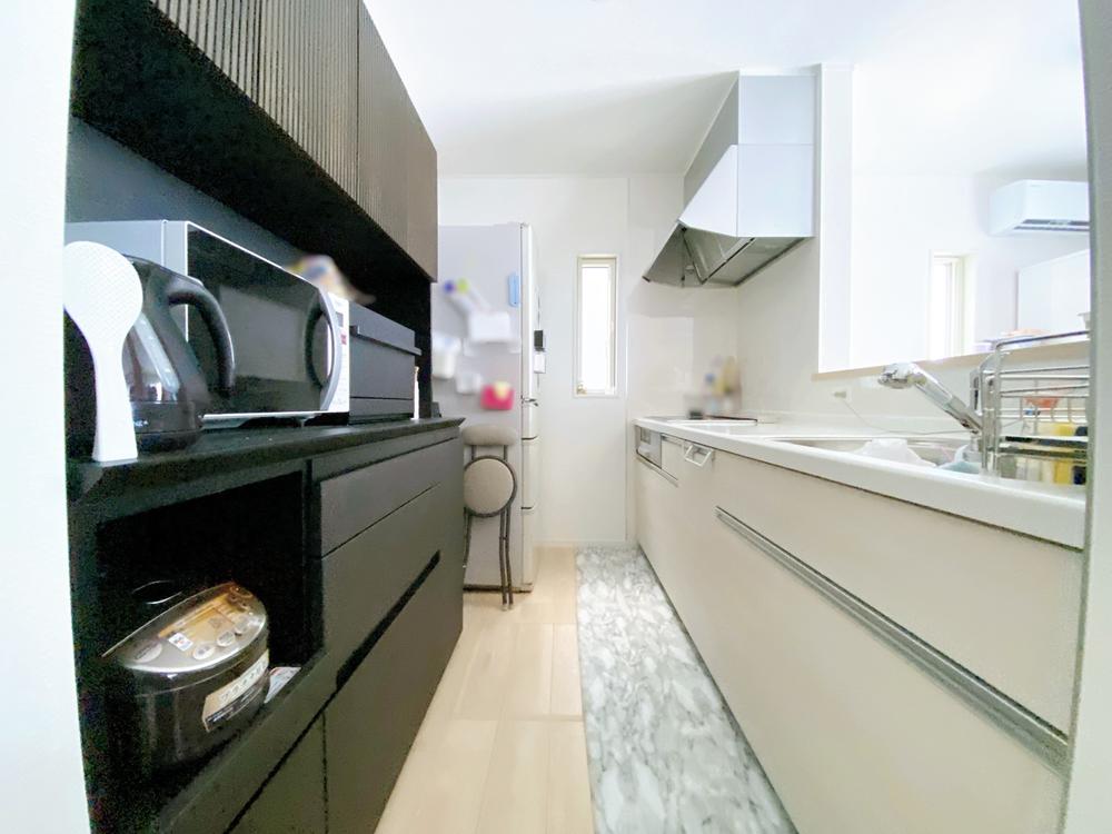 調理しながら、お子さまやお客さまと会話が弾む対面式キッチン。シンクやワークトップも明るい色で統一されており、すっきりとした見た目です。(所有者居住中)