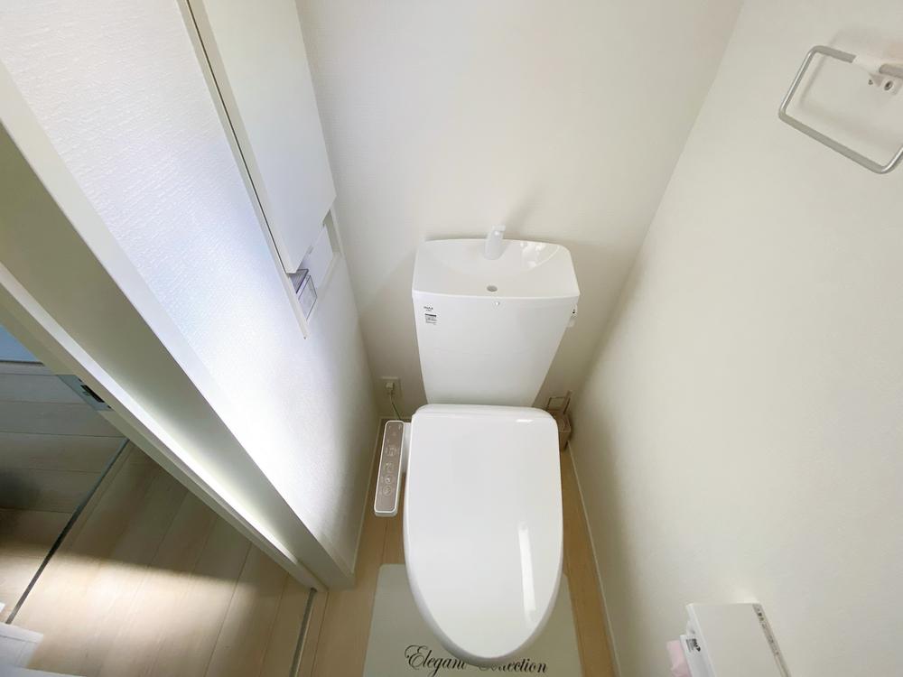 温水洗浄便座付きのトイレで、一年を通して快適にご利用できます。季節の小物や予備のトイレットペーパーを置ける棚付きです♪(所有者居住中)