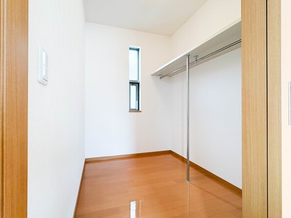 【WIC(ウォークインクローゼット)】 たくさんの洋服をかけてもシワになりにくいウォークインクローゼット。洋服以外にも、普段使わない家電やスーツケース、ストック品など何でも片付く嬉しい空間です。
