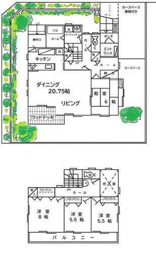 | 備考 | バルコニーと2台カースペースは屋根付きで雨でも安心。1.25坪の広々お風呂、20.75帖の広々リビングからウォークスルーで行けるウッドデッキ、便利な勝手口など欲しいが揃っているテラコッタカラーハウス。 | ||||