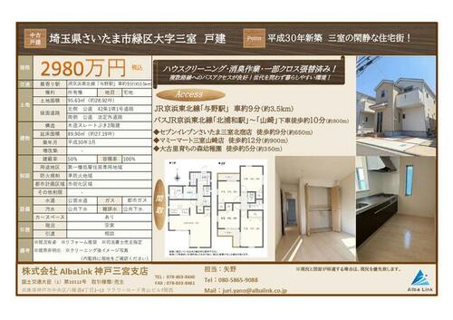 | 備考 | ・JR京浜東北線「与野」駅 車約9分(約3.5km)・JR京浜東北線「北浦和駅」 バス9駅乗車(約4分)停留所「山崎」 徒歩約10分(約800m)・複数路線へのバスアクセスが良好!・周辺にはスーパーやドラッグストアも点在。世代を問わず暮らしやすい環境・駐車スペースあり・4LDKの間取り◇ライフライン上水道:公営水道下水道:公共下水ガ ス:都市ガス◇Life Information・セブンイレブンさいたま三室北宿店 徒歩約9分(約650m)・マミーマート三室山崎店 徒歩約12分(約900m)・大古里育ちの森幼稚園 徒歩約5分(約350m)・さいたま市立病院 徒歩約12分(約882m)・ドラッグストアセキ三室店 徒歩約10分(約741m)内見も出来ますのでお気軽にお問合せください!ぜひご検討の程、よろしくお願いいたします。お問い合わせは 担当:矢野 まで!営業時間:10:00~19:00 毎週水曜日・日曜日がお休みとなります。※現況有姿※リフォーム推奨※司法書士売主指定※境界非明示・私道負担:なし・【埼玉県さいたま市緑区大字三室 戸建】・ハウスクリーニング・消臭作業・一部クロス張替済み!・築浅戸建 三室の閑静な住宅街です! | ||||