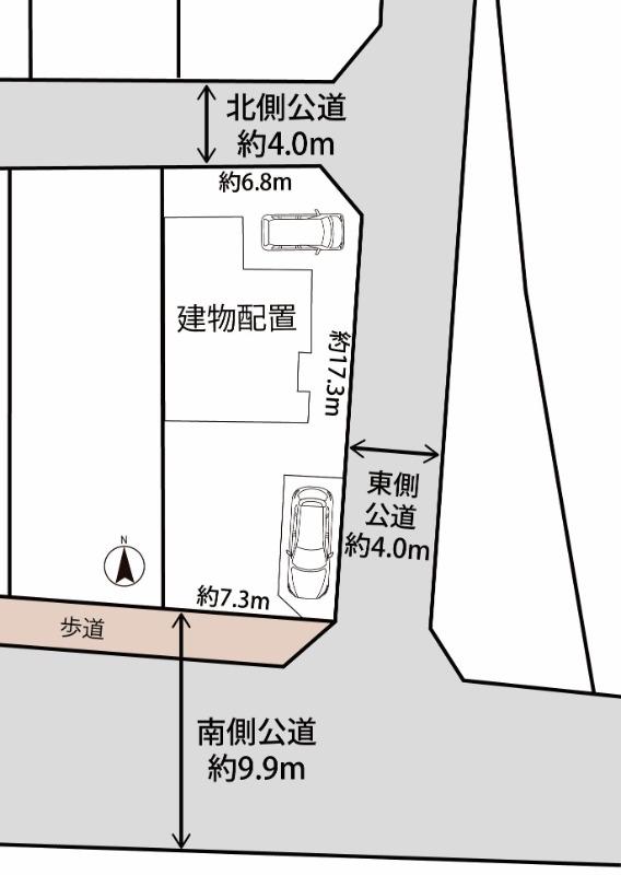 土地権利 | 所有権 | 私道負担・道路 | 無、北4m幅(接道幅6.8m)、東4m幅(接道幅17.3m)、南9.9m幅(接道幅7.3m) | ||