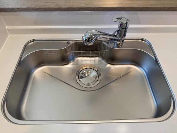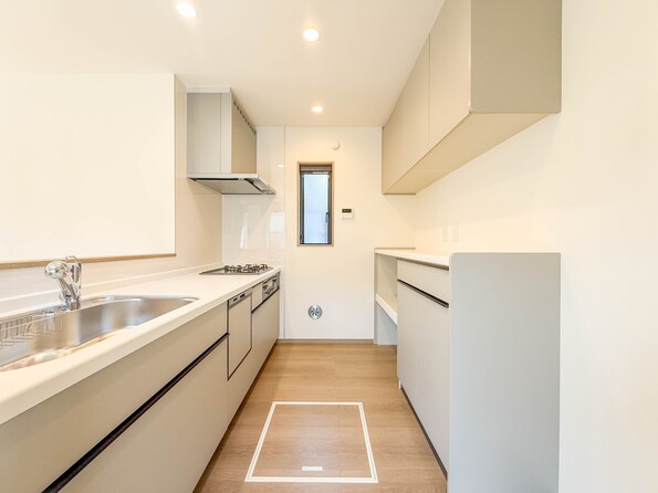 1号棟【LDK 16.87帖】 三口コンロで料理の幅を拡げてくれる使いやすいシステムキッチンを採用。洗い場も大きいので野菜や食器を洗ったりする際にも捗り、奥様の強い味方となってくれるはずです。