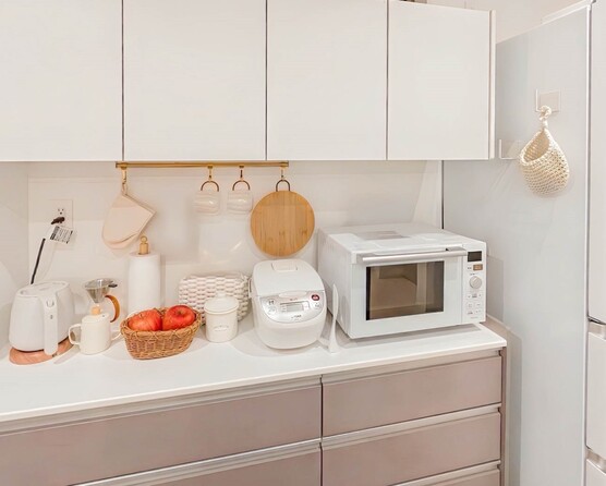 【カップボード】食器類、各種洗剤、ハンドソープの詰替え、ゴミ袋、常温保存の食材、などなど、様々な物品の収納場所として使えるカップボードです。電子レンジや炊飯器も設置できます。