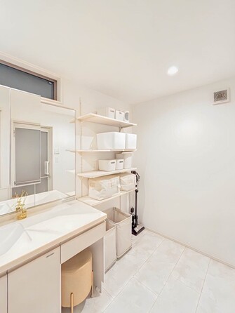 大きく見やすい三面鏡で清潔感ある洗面台は、身だしなみチェックや肌のお手入れに最適です。何かと物が増える場所だからこそ、スッキリと見映えの良い空間に拵えました。