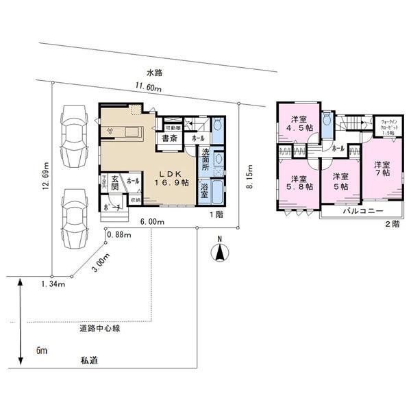 土地権利 | 所有権 | 私道負担・道路 | 共有持分175㎡×(1/7)、南6m幅 | ||