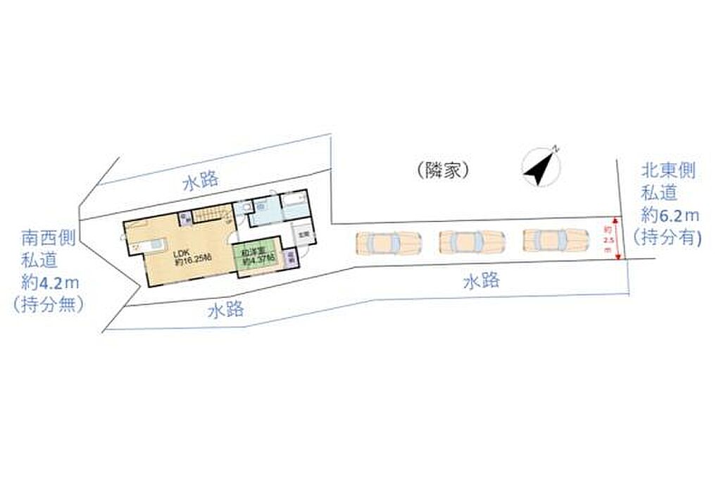 | 私道負担・道路 | 384.0m2 私道負担割合1/14 | 接道状況 | 二方 ( 北東 6.2m 私道 ) ( 南西 4.2m 私道 ) | ||