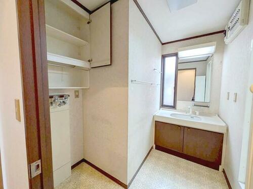 ~草加市手代 戸建 限定1棟~広々とした洗面室です。洗面台はシャワー付きで便利。洗濯機置き場にはサニタリーなどを収納できる棚付きで、使いやすい造りとなっています。室内(2026年2月撮影)