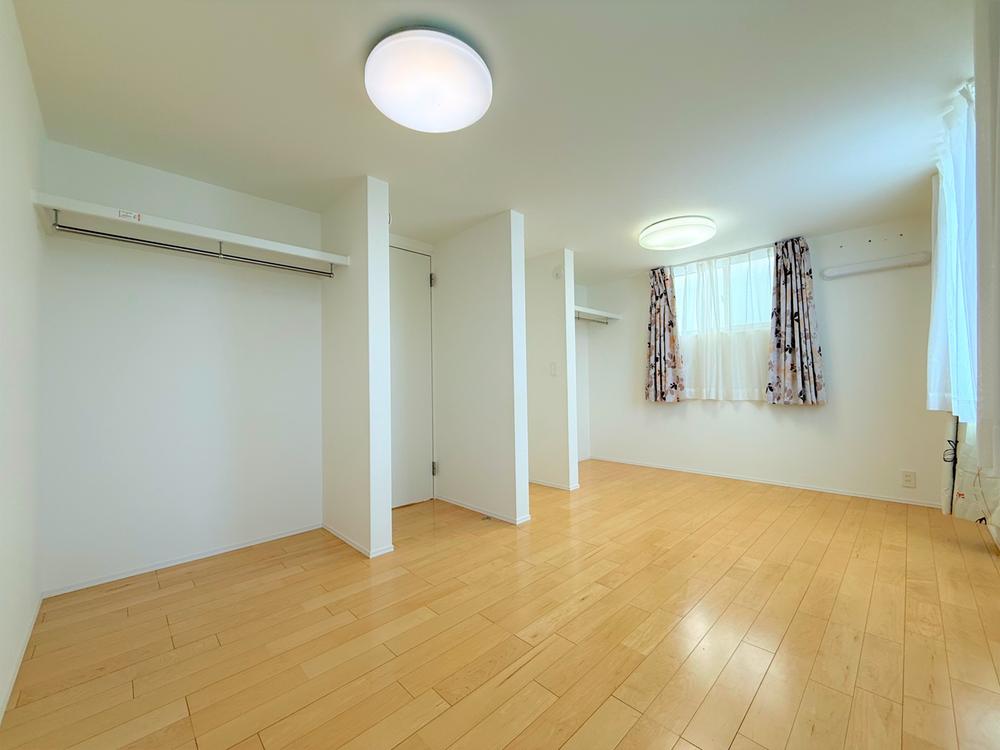 【洋室-機能的】衣類だけでなく、バックやシーズンオフの物、掃除道具などを収納できるクローゼットや室内物干しがついている機能的な空間でございます!このお部屋からバルコニーへ出ることもできます!