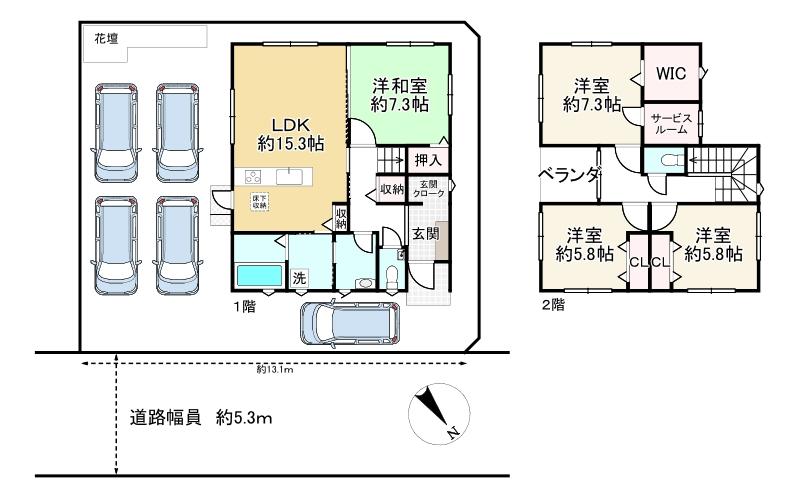 | 土地権利 | 所有権 | 私道負担・道路 | 無、北東5.3m幅(接道幅13.1m) | ||