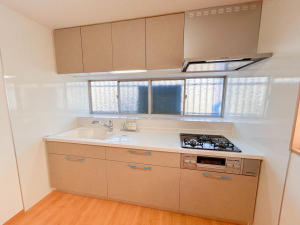 【リフォーム済 システムキッチン】新しいシステムキッチンのワークトップとシンクは清潔感ある人工大理石仕様としました。さらに三口ガスコンロ・魚焼きグリル・スライド式収納など機能も充実しています。