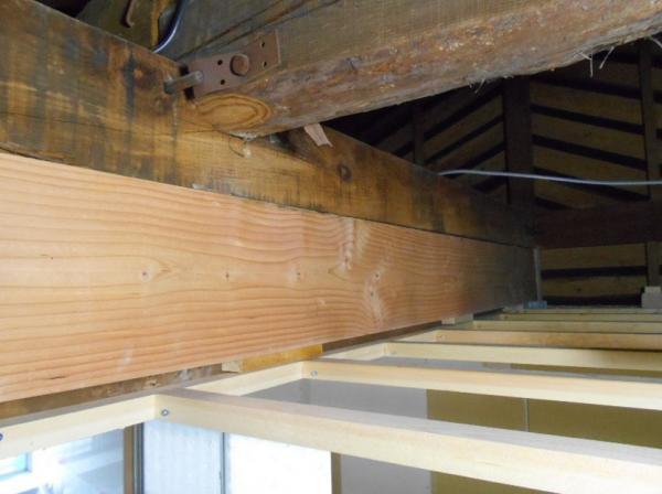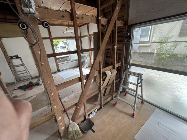 【工事中風景 筋交い】工事を開始する際には専門の設計会社による耐震診断を行っています。構造上大事な部分の壁の内部には耐震部材(筋交い)が確認できます。当住宅においては新耐震基準に適合するとの評価を受けております。