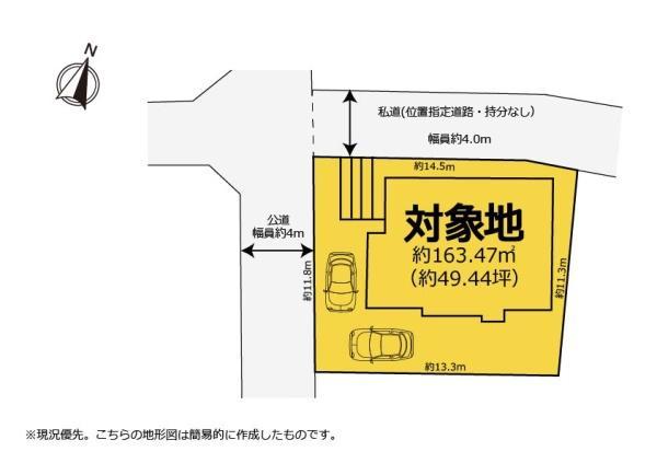 | 土地権利 | 所有権 | 私道負担・道路 | 無、西4m幅(接道幅11.8m)、北4m幅(接道幅14.5m) | ||