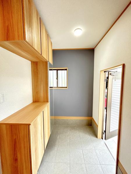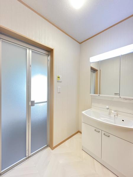 【年内入居可】【リフォーム済】洗面所は新品の洗面台に交換しました。床のクッションフロアと壁・天井のクロス張替を行い、明るく清潔感のある洗面脱衣所に仕上がりましたよ。洗濯用の水栓も交換致しました。