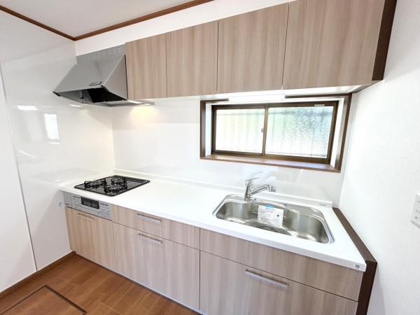 【耐震補強工事実施】【リフォーム後写真】リビング側からキッチンを撮影。勝手口をつぶしてI型のキッチンを設置。冷蔵庫スペースも作成し電化製品も置きやすいようリフォームをおこないました。システムキッチン交