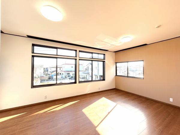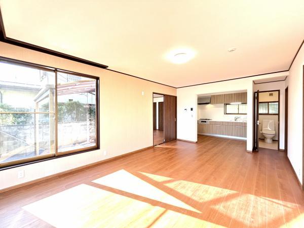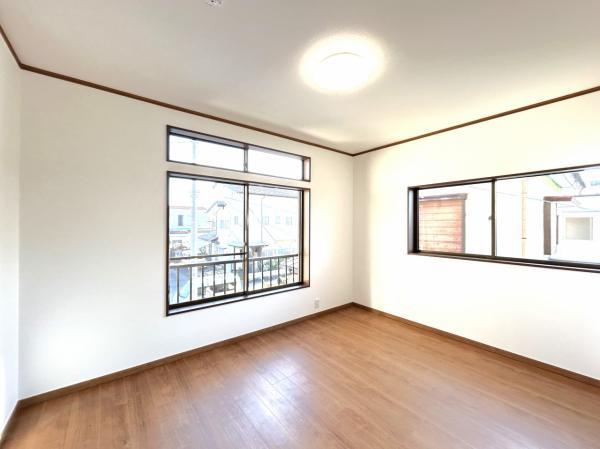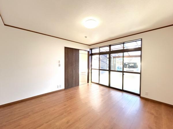 【耐震補強工事実施】【リフォーム後写真】1階西側居室別角度写真です。南側に大きな窓があり明るい空間です。外には洗濯物干しスペースがあります。フローリングに変更し、クロス張り、照明交換をおこないました。