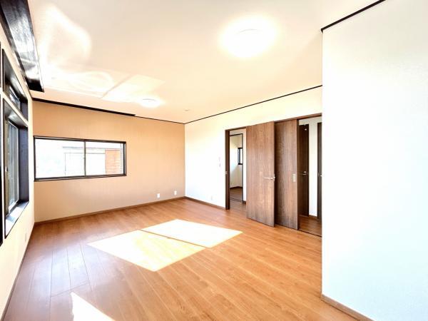 【耐震補強工事実施】【リフォーム後写真】2階洋室写真です。入り口が2か所あるので将来のライフスタイルに合わせて、フレキシブルに使えるお部屋です。フローリング上張り、照明交換、クロス張替えをおこないまし