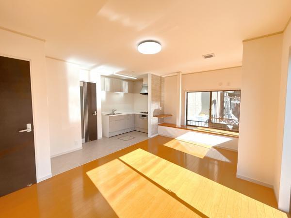 【リフォーム完成/年度内入居可能】リビングの別角度写真です。約12.12帖のスペースにL字型のキッチンが備えられています。キッチン回りは水に強いクッションフロアに張り替えを行いました。