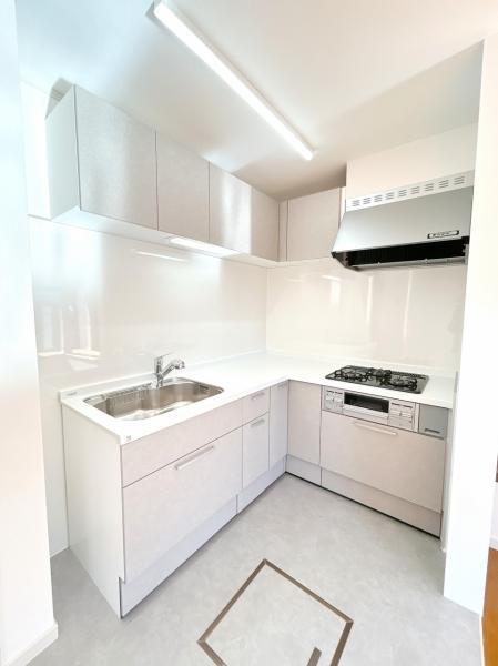 【リフォーム完成/年度内入居可能】キッチンは対面式からL字型のシステムキッチンに変更しました。吊戸棚も設置されていますので、お料理道具などもたくさん仕舞えそうですね。